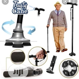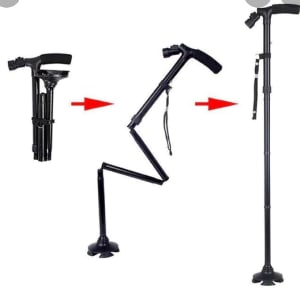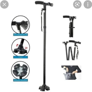 عكاز للمسنين ذو قاعدة متينة تقف دون الحاجة الي اسنادها يمكن ثنيها لتصبح قطعة صغيرة سهلة الجمل والتخزين مزودة بكشاف للاضاءة حتى يسهل على كبار السن استخدامها والاتكاء عليها
